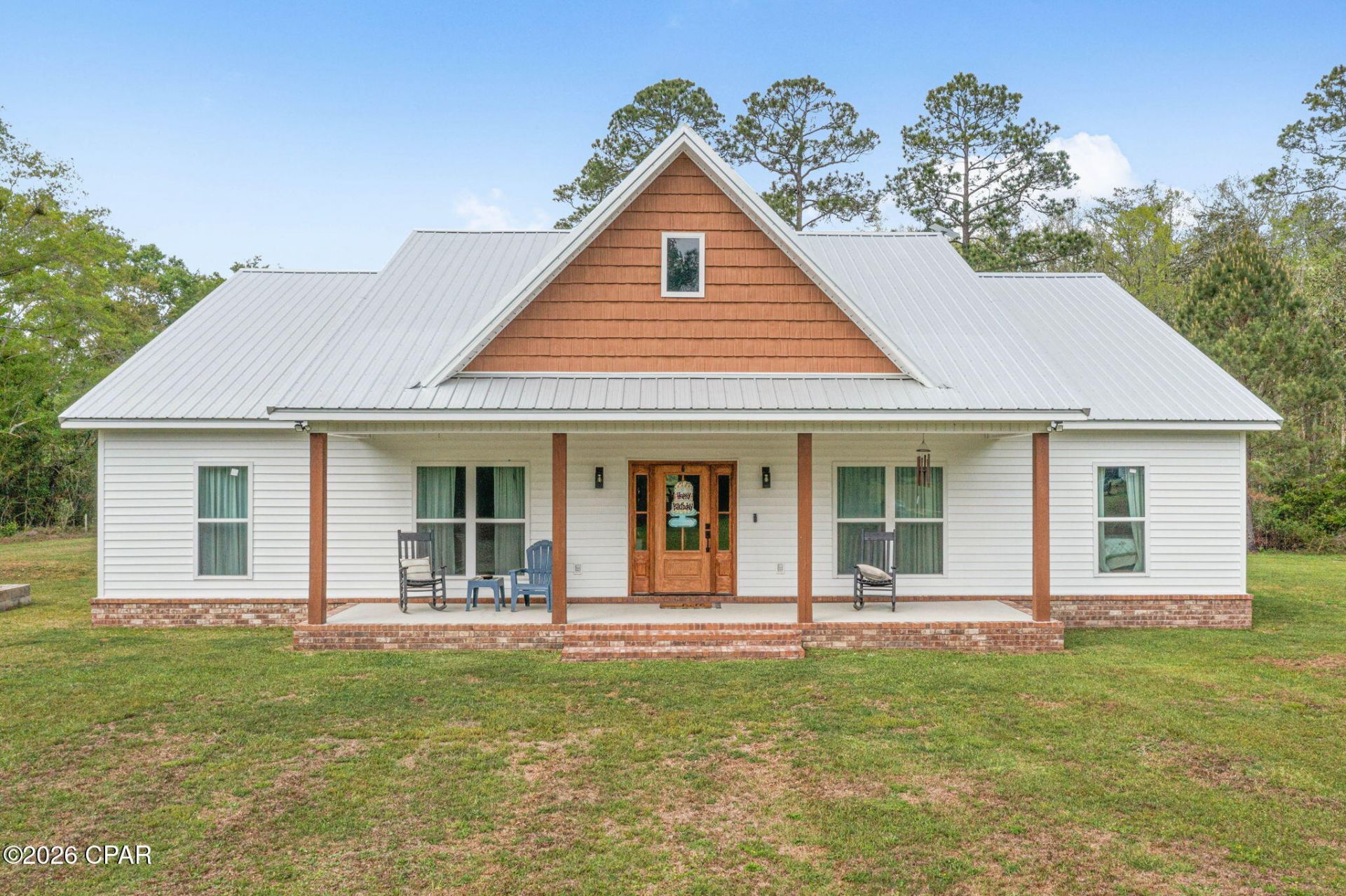 Welcome to this beautifully designed 3-bedroom, 2-bath home set on 6. 19+/- acres, offering the perfect blend of modern farmhouse charm and peaceful country living. From the moment you step inside, you'll love the open-concept layout featuring vaulted ceilings with exposed wood beams, a stunning shiplap fireplace wall, and custom built-in shelving that creates a warm and inviting focal point. The kitchen is a true standout, offering a large island with seating, stainless steel appliances, custom cabinetry, and a gorgeous vent hood that adds character and style. Just off the kitchen, a spacious walk-in pantry provides plenty of storage and organization. The split floor plan offers privacy, with a spacious primary suite featuring a spa-like bathroom complete with dual vanities, custom tiled shower, and an oversized walk-in closet. Two additional bedrooms and a full bath are located on the opposite side of the home, perfect for family or guests. Additional features include a well-appointed laundry room with cabinetry and workspace, durable vinyl plank flooring throughout, and thoughtfully designed finishes in every room. Step outside to enjoy the covered front porch overlooking your private setting. The outdoor space is ready for both relaxing and entertaining with a firepit area, portable storage shed, and a 32x60 open pole barn with 5 bays--perfect for equipment, vehicles, or hobbies. If you've been searching for space, style, and a quiet country setting with convenient access to nearby areas, this property checks all the boxes.