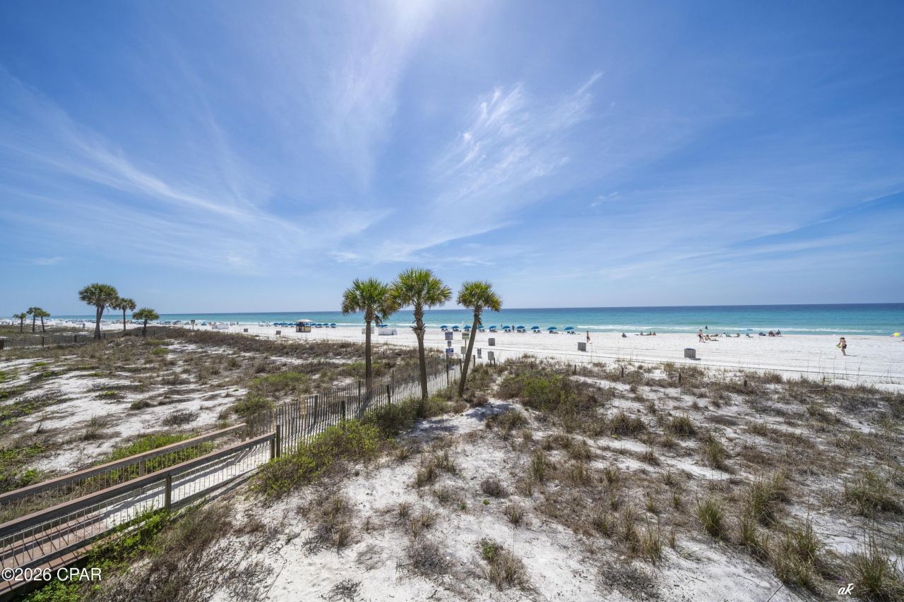 Looking for that hidden gem that offers the most amenities along a white sandy beach with turquoise waters, lower dues and built in rental revenue? How about just steps to the sand, no elevator required? Windward 105 is it! Edgewater Beach Resort is Panama City Beach's only full-service resort with 11 pools (10 heated seasonally), including a large tropical lagoon-style beachside pool with lush landscaping, waterfalls and private cabana rentals, a kids' splash pad, four gulf-front hot tubs, 10 plexicushion tennis courts, 5 pickleball courts, 10 shuffleboard courts, basketball court, an executive par-3 golf course, a robust fitness center, electric car charging stations, tram service around the property, Ocean's Restaurant onsite with poolside service, Edgie's market (Starbuck's) for treats and essentials, a conference center, and more all behind a gated complex with 24-hour security. The Windward building is a low-density, mid-rise condominium that sits on the quiet, far west side of the Edgewater property. Owners and guests get the best of both worlds; private and peaceful open beach space with all the amenities just a short walk or tram ride away. No elevators are required, as this unit is on the coveted 1st floor just steps away from the beach. W-105 is the only 1-Bedroom/2-Bath unit with this floor plan currently available, which has the *LOWEST* HOA dues in Leeward/Windward. The condo offers 816 square feet of living space and comfortably sleeps 4. The floor-to-ceiling beachside glass and patio door was replaced in 2024 to meet current hurricane and turtle glass standards (not many units have this upgrade). The south-facing view offers both sunrise and sunset, giving you unparalleled beauty from the private covered balcony any time of day. Views of the pier, seagulls, dolphins at play, peaceful tides rolling in, it's all here! Step inside the unit and immediately take in the stunning Gulf views from the living, dining and kitchen areas. The kitchen has updated Diamond cabinets, granite countertops, stainless steel appliances and comes fully stocked with everything needed. It overlooks the living and dining area with a built in breakfast bar, creating the perfect setting for entertaining. The Master Bedroom Suite offers a private bath and a laundry area with a new stackable washer and dryer, adding extra convenience for longer stays. The second bathroom is large and located away from the living area. Both bathrooms have the same Diamond cabinetry and granite countertops as the kitchen for a cohesive aesthetic. The wood-look tile floor throughout the unit allows for easy upkeep. The hot water tank was replaced in 2020. The HVAC is from 2018 and has been on a maintenance contract (2 routine visits per year) since the owners purchased the unit in 2019. This condo is sold fully furnished and rental ready, making it an excellent turnkey investment or a luxurious second home. New furniture and upgraded mattresses in the bedroom and on the sleeper sofa ensure continued guest comfort. The unit has a proven rental history with many repeat guests. Rental actuals can be provided upon request (see agent to agent remarks). The current rental bookings for 2026 date out until August, with more bookings being added every day, and they can transfer with the sale if the Buyer chooses to use the same rental management company. Discover your dream coastal retreat at Windward 105 in Edgewater Beach Resort today before it's gone!