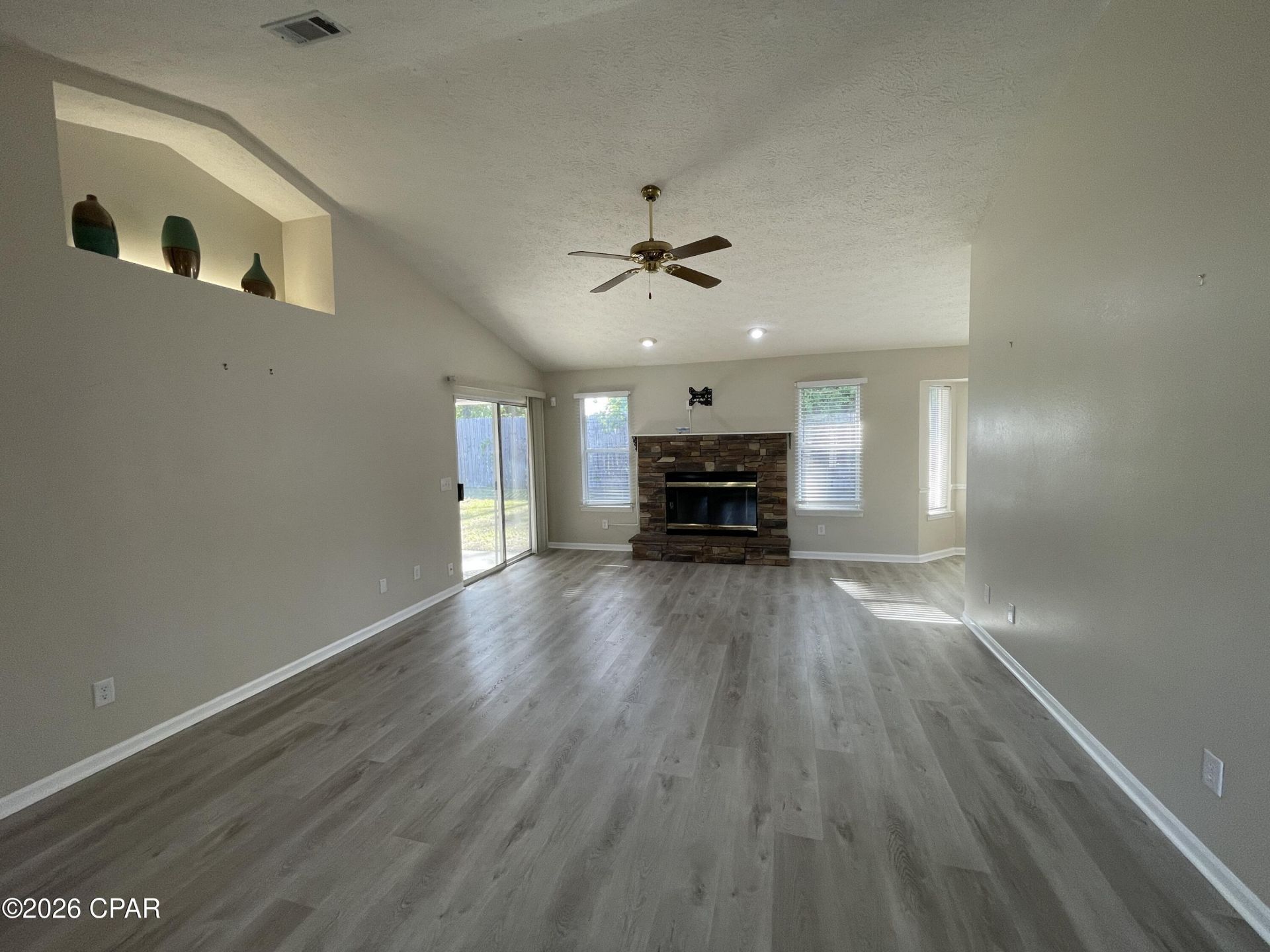 For Lease - A welcoming 3-bedroom, 2-bath home in the desirable Treasure Palms neighborhood of Panama City Beach. This well-maintained property features an updated kitchen with granite countertops, stainless steel appliances, ample cabinet storage, and a cozy breakfast nook. The kitchen includes a refrigerator with ice maker, stove top, oven, and dishwasher. A formal dining room opens to the living area, highlighted by a stacked-stone wood-burning fireplace for added charm. The split bedroom layout offers two guest bedrooms with a shared hallway bath featuring a tub/shower combination, while the spacious master suite includes a jetted tub, walk-in shower, walk-in closet, and private toilet room. Enjoy a large, fenced backyard with a double gate for boat storage and a covered back porch perfect for relaxing outdoors. Inside laundry room just off the two-car garage. Conveniently located near the Navy base, Publix, local restaurants, and the beach, this home offers comfort and coastal convenience in a quiet community. *Dogs negotiable with $250 pet deposit, $50 pet fee, $25 monthly pet rent. No cats allowed.